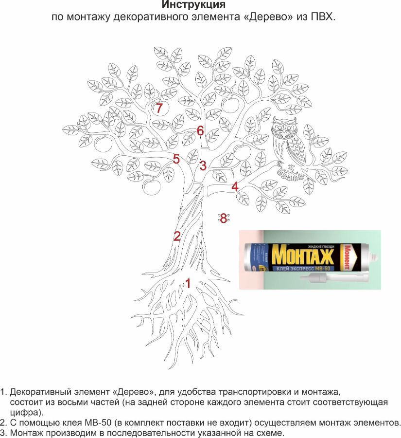 Декоративный элемент "Дерево" изготавливается стандартно из: пленки (наклейка из 5 частей), (опц. ПВХ 3мм, ПВХ-4мм, ПВХ 5мм, ПВХ-8мм ).